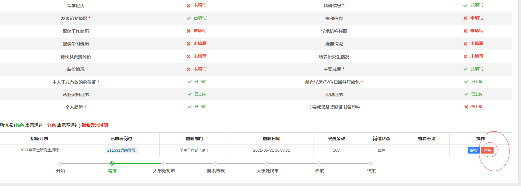 再讲草稿状态的应聘信息删除,重新提交岗位(注:已填写的岗位资料系统会自动保留,无需重新提交岗位资料,仅需对应聘的岗位简历进行提交即可。)