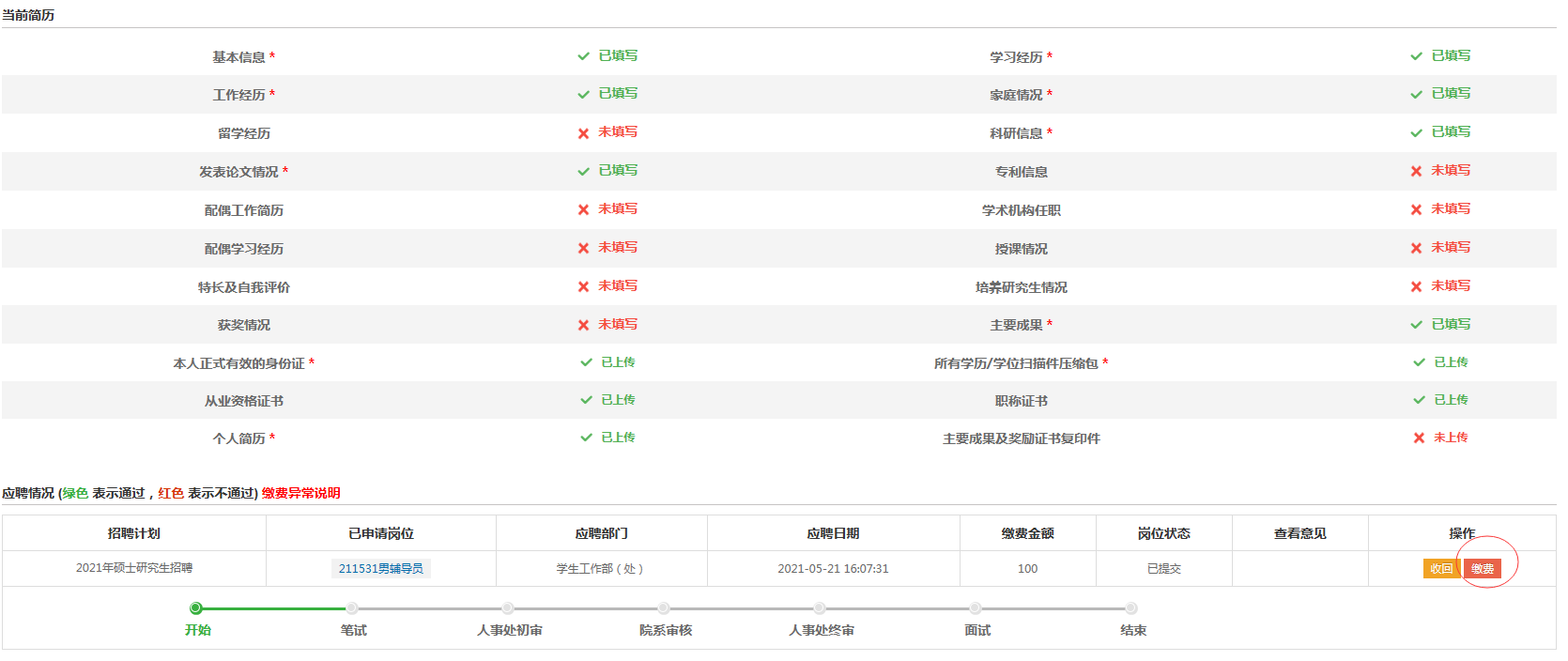 提交岗位完毕后,点击交费,并保证在第一次打开交费时,将交费办理完成即可。