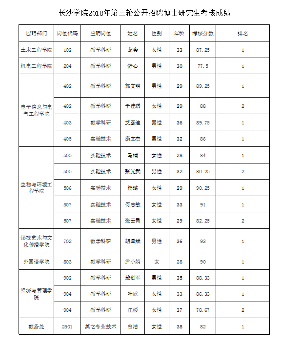 长沙学院2018年第三轮公开招聘博士研究生工作已经完成报名、考核等程序,根据《长沙学院2018年第三轮公开招聘教学科研人员简章》相关规定,共有17人参加考核,经考核,12人进入体检环节,现将名单及有关事宜公布如下。